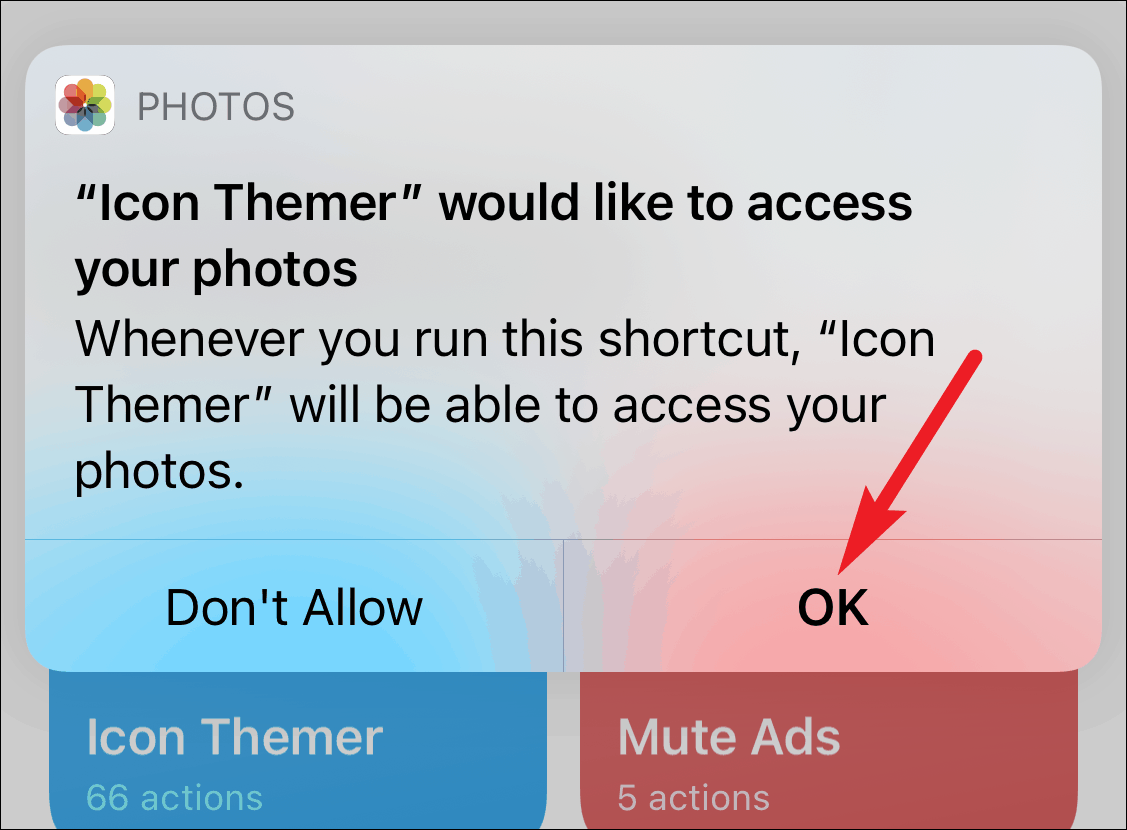 Icon Themer would then ask for access to your Photos. Tap on ‘OK’ to grant it access. Had we chosen ‘Choose from Files’, then you wouldn’t have to grant explicit access. Your Photos will open. Tap the photo you want to use as the icon to select it. Note that Icon Themer doesn’t have the option to adjust the thumbnail while selecting the icon like you can with the other trick.