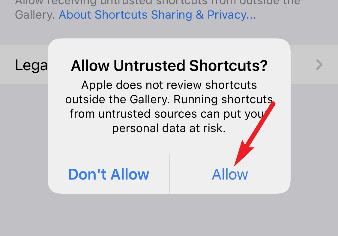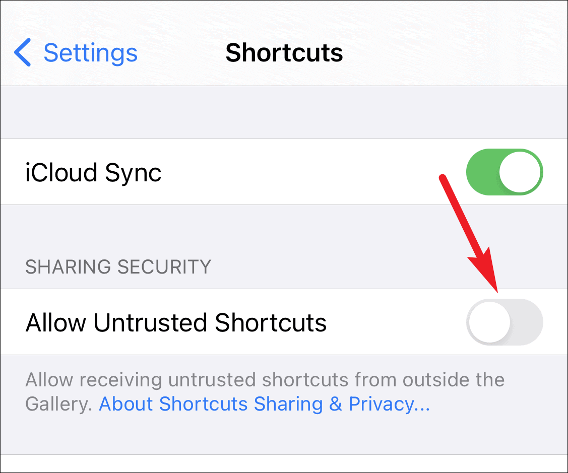 Then, turn on the toggle for ‘Allow Untrusted Shortcuts’.