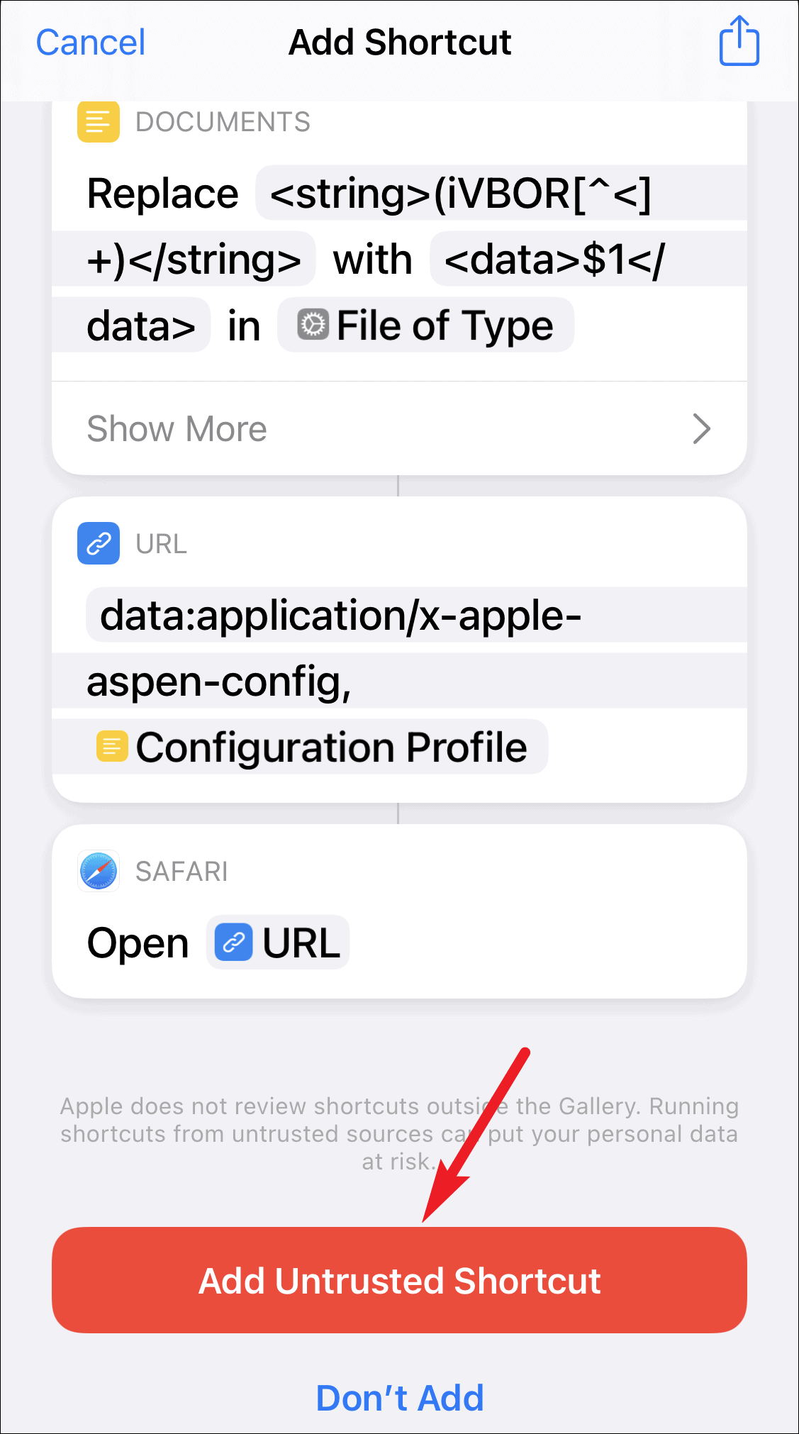 Now, go back to the link on your browser and tap the ‘Get Shortcut’ button. Now, it’ll open the ‘Add Shortcut’ page in the Shortcuts app. You can review the whole shortcut code on this page before you decide to add it. To add it, scroll to the very end and tap the ‘Add Untrusted Shortcut’ button.