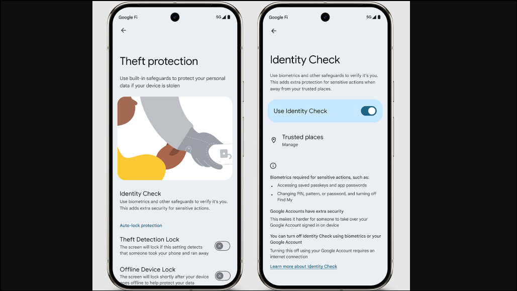 What is Identity Check? Identity Check is a security feature that essentially locks critical device and account settings when your Android device is not present in a trusted location. If anyone wants to access such settings in such a location, they will first have to authenticate themselves using a fingerprint, facial recognition, or other biometric options available on the device. Settings that Identity Theft can block access to include adding a Google account, turning off 'Find My Device', adding a new fingerprint, changing the screen lock, performing a factory reset, etc.