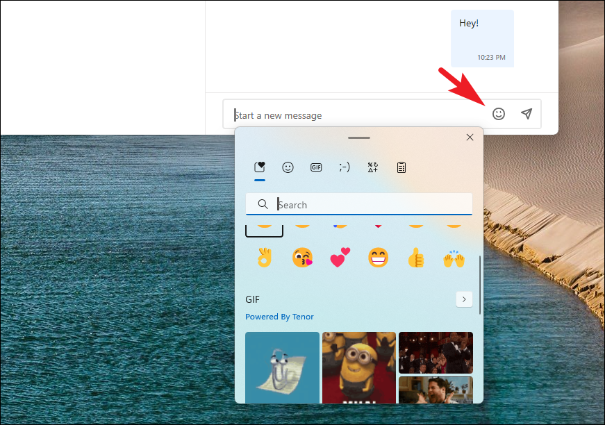 Step 6: You can also add emojis, GIFs, and kaomojis to your messages by clicking on the 'Emoji' button next to the text box and selecting the desired symbol.