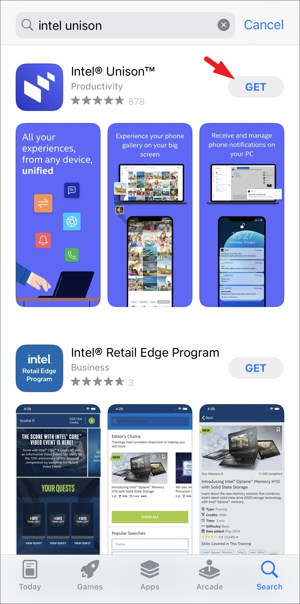 Step 4: In the search results, locate Intel Unison and tap the 'Get' button next to it. Authenticate the download using your Apple ID, Face ID, or Touch ID.