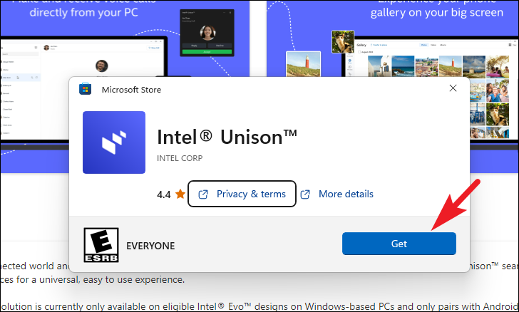 Step 3: In the Microsoft Store, click on the 'Get' button to download and install Intel Unison on your computer.