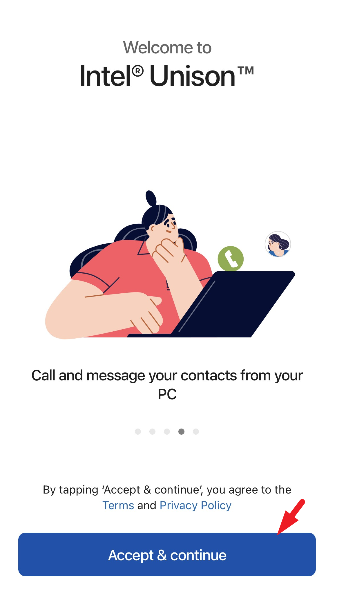 Step 5: After the app installs, open Intel Unison. Tap 'Accept & Continue' to proceed.