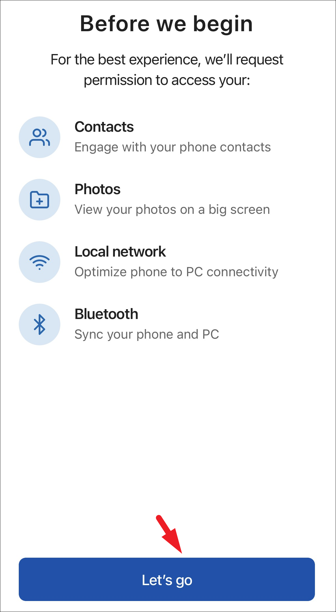 Step 7: The app will require access to certain permissions to function properly. Tap 'Let's Go' to start granting permissions.