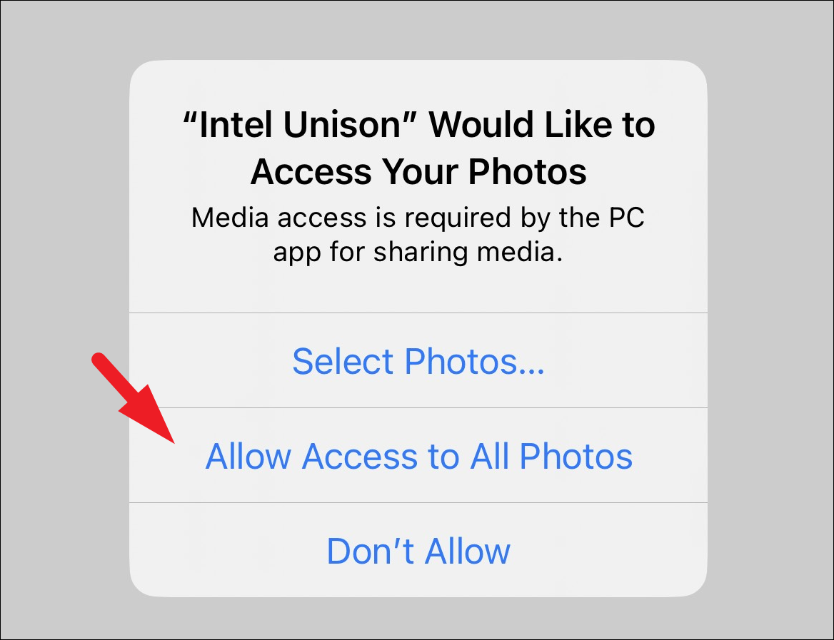 Step 8: When prompted, allow Intel Unison to access your Contacts, Photos, Local Network, and Bluetooth by tapping 'OK' or 'Allow' on each permission alert. For Photos, you can choose 'Allow Access to All Photos' or select specific photos if you prefer.