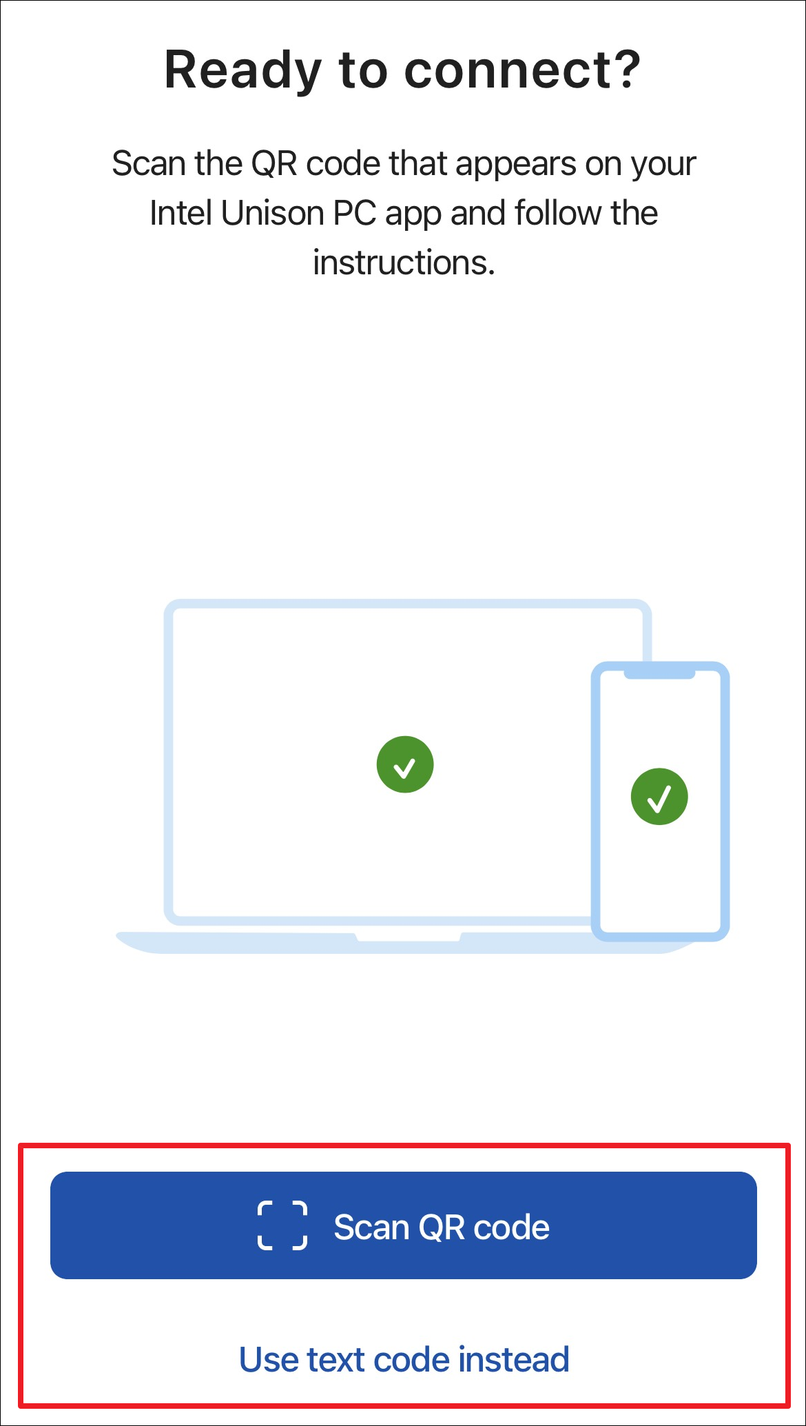 Step 1: On your iPhone, tap 'Scan QR Code' in the Intel Unison app. If you prefer, you can tap 'Use text code instead' to enter a code manually.