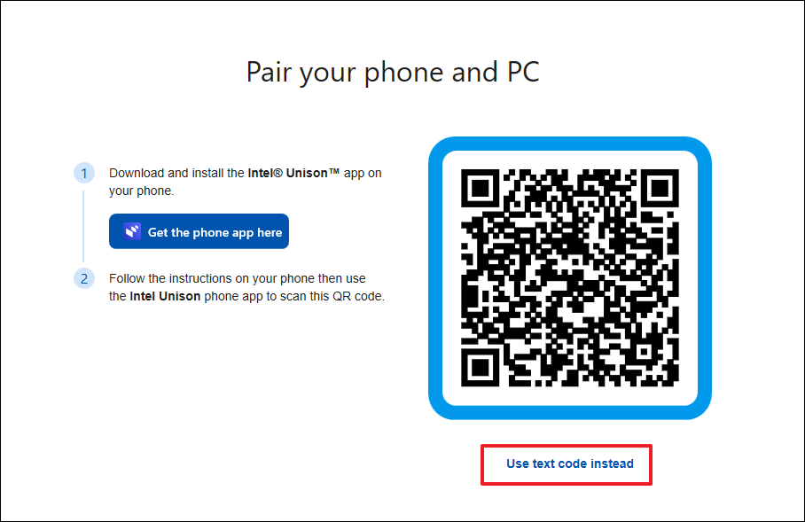 Step 2: On your Windows PC, you should see a QR code on the Intel Unison app pairing screen. Use your iPhone to scan this QR code. Alternatively, if you're using the text code method, click 'Use text code instead' on your PC and enter the code shown into the app on your iPhone.