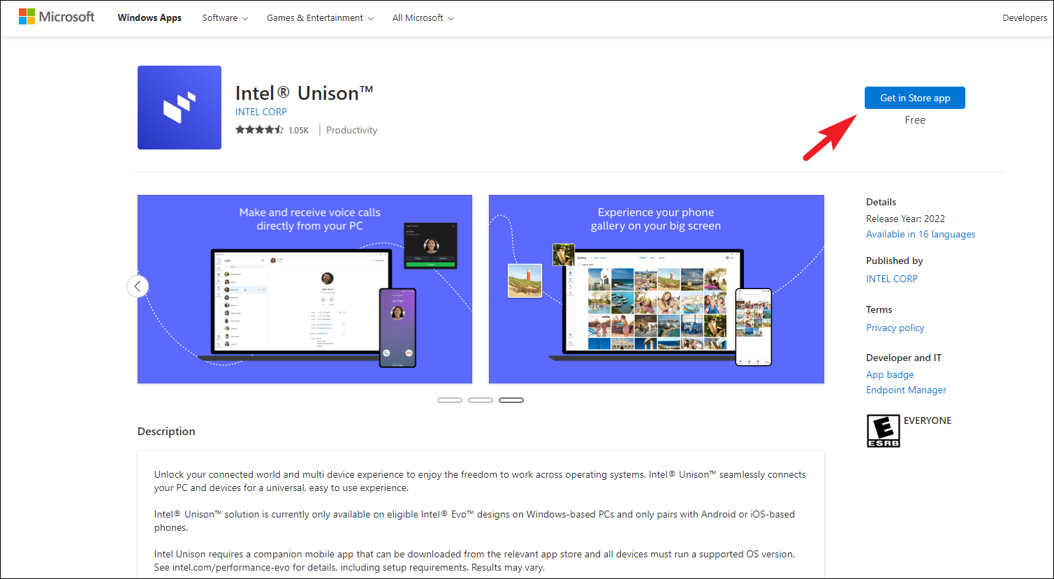 Intel Unison is available on the Microsoft Store. However, if you can't find it through the Store's search function in your region, you can download it directly from the Microsoft website.