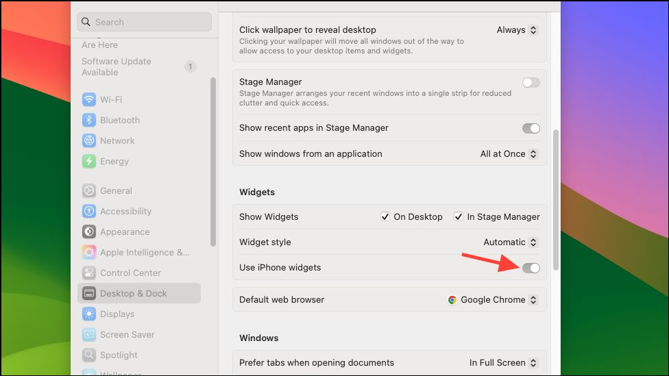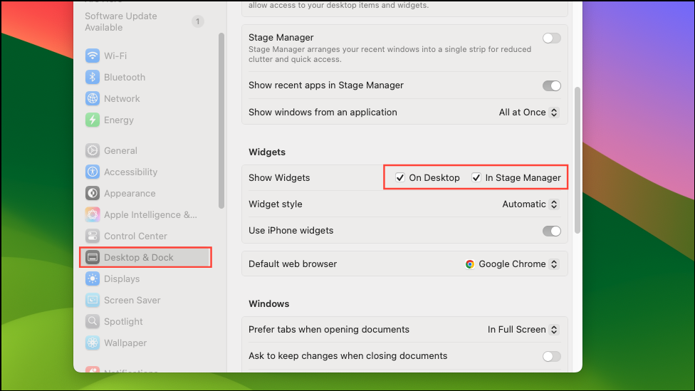 Step 2: Navigate to Desktop & Dock. Here, you can choose whether widgets appear on your desktop at all times or only in Stage Manager. You can also adjust the widget style to Automatic, Monochrome, or Color.