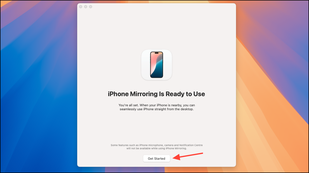 - Within a few seconds, iPhone Mirroring will be ready to use. Click on 'Get Started' on the Mac to proceed.