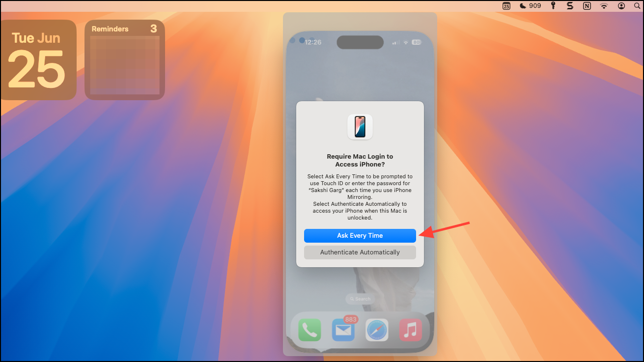 - Then, you'll get a prompt asking whether you want your Mac to require the user password/ TouchID each time you want to use the iPhone Mirroring app on the Mac to authorize automatically when the Mac is unlocked. Choose according to your preference; you can change it later from the iPhone Mirroring app settings.