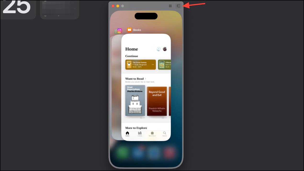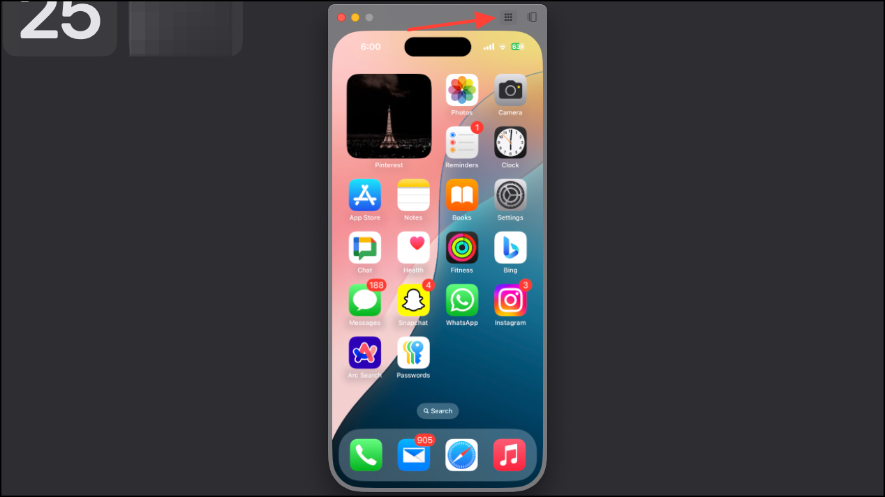 - Alternatively, hover above the upper edge of the iPhone Mirroring app to bring the window controls. Then, click the grid icon.