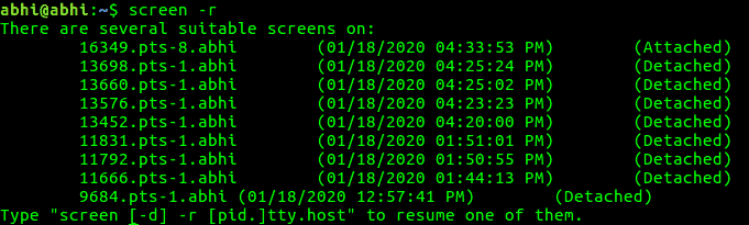 screen -rIf you have multiple detached sessions, this command will list them and prompt you to select one to reattach.