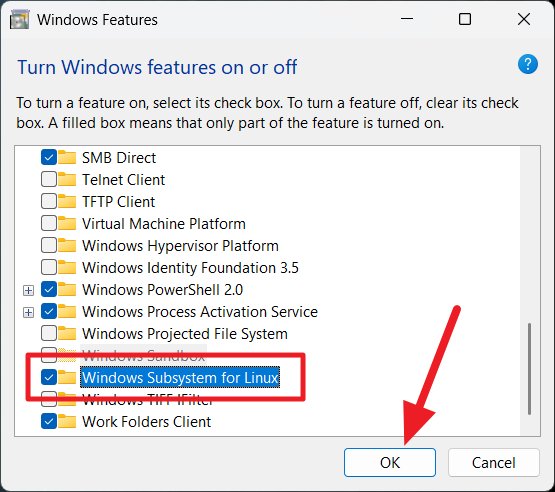 In the Windows Features dialog box, tick the ‘Windows Subsystem for Linux’ option and click ‘OK’