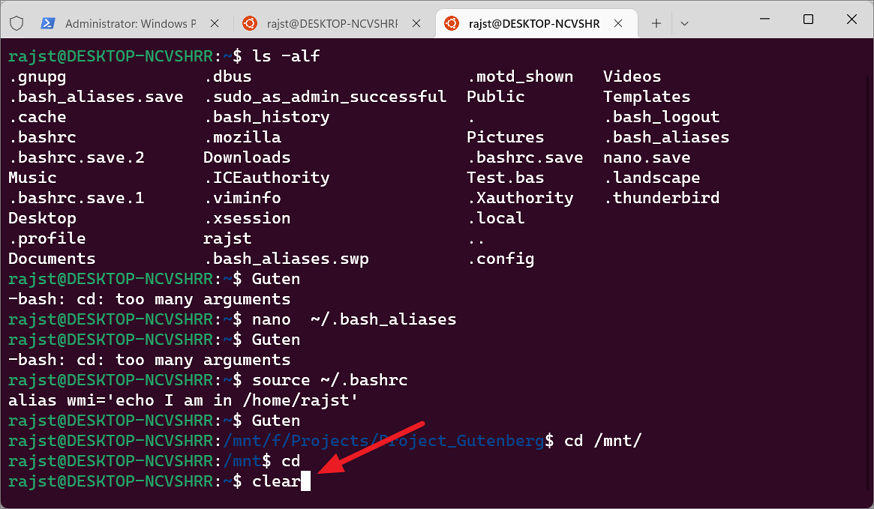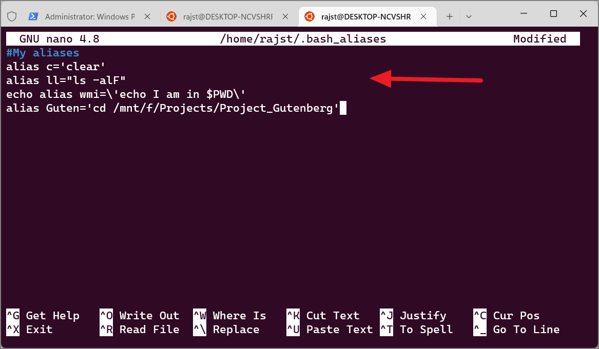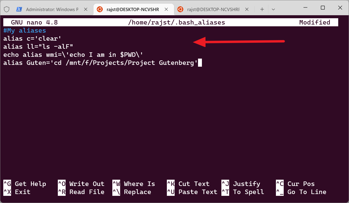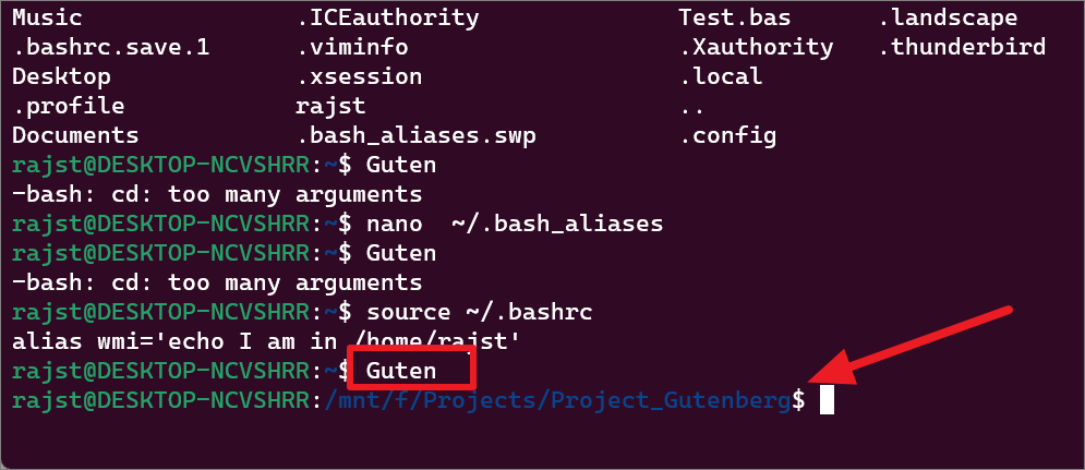 alias Guten='cd /mnt/f/Projects/Project Gutenberg'You can also leave a comment before your aliases (like #My Custom Aliases) for organization purposes.