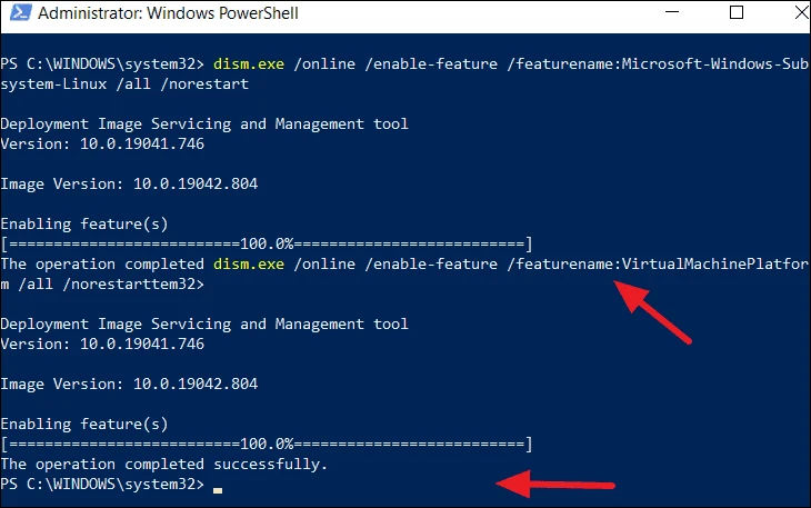 dism.exe /online /enable-feature /featurename:Microsoft-Windows-Subsystem-Linux /all /norestartdism.exe /online /enable-feature /featurename:VirtualMachinePlatform /all /norestart