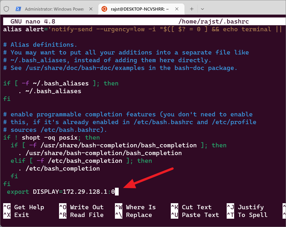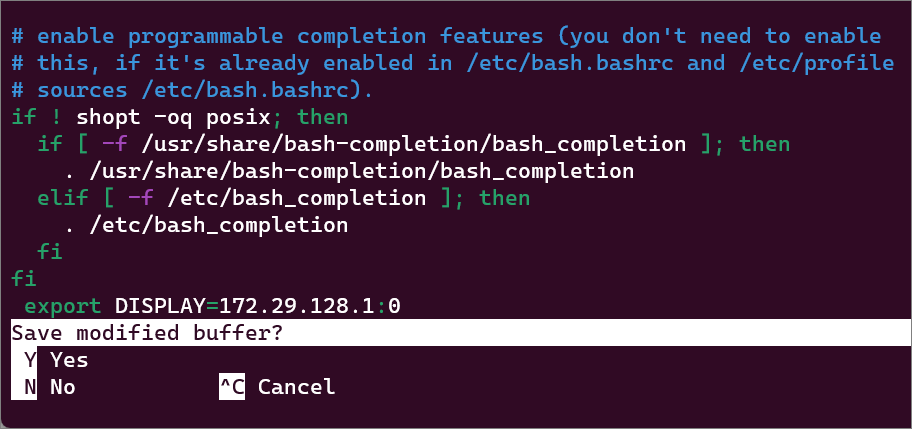 export DISPLAY=$(cat /etc/resolv.conf | grep nameserver | awk '{print $2}'):0 Then, press Ctrl+X and then Y to save the script. After that, hit Enter to exit the script.