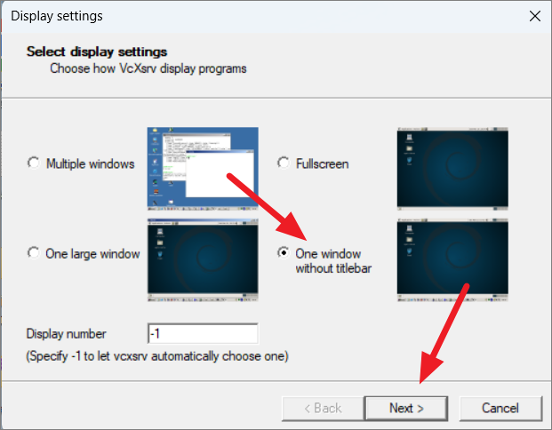 Then, choose a display option in the Display settings window and click ‘Next’. Here, we are selecting the ‘One window without titlebar’ option.