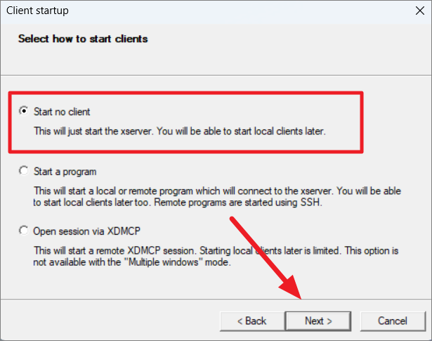Under Client startup, select the ‘Start no client’ option and click ‘Next’ to start only the server.