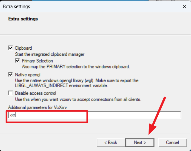 On the next screen, add all the additional parameters needed by you for the X server in the field below and click ‘Next’. In the example, we are adding -ac.