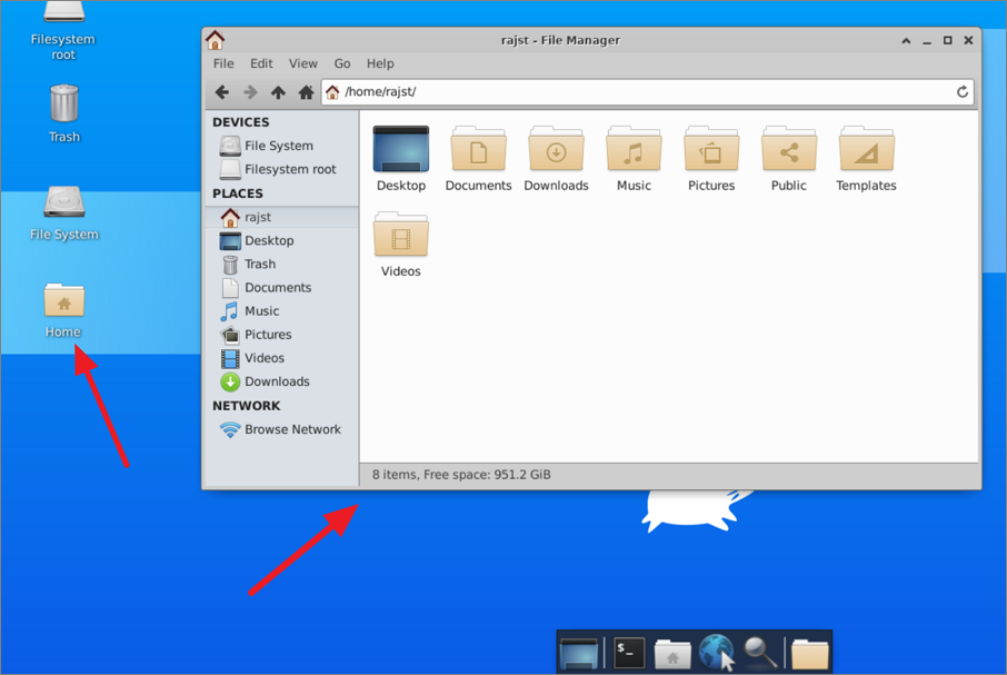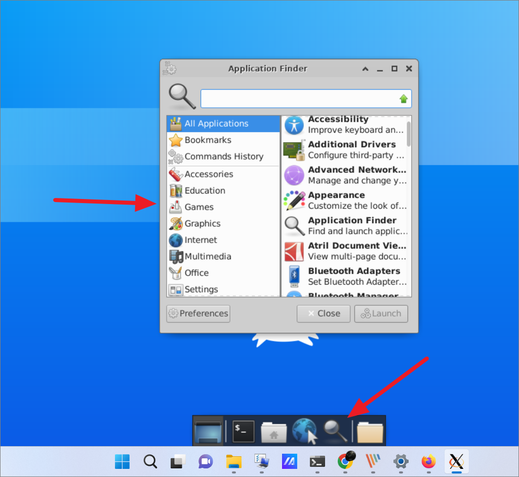 To open applications, click the search button (Application Finder) at the bottom of the Xfce desktop. Then, find and click on the application from the Application Finder menu to launch the app.
