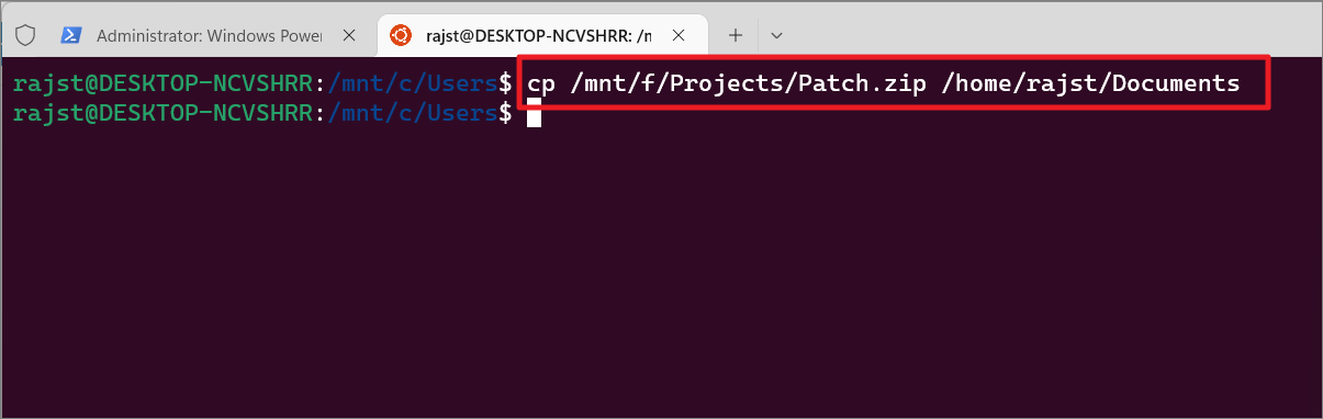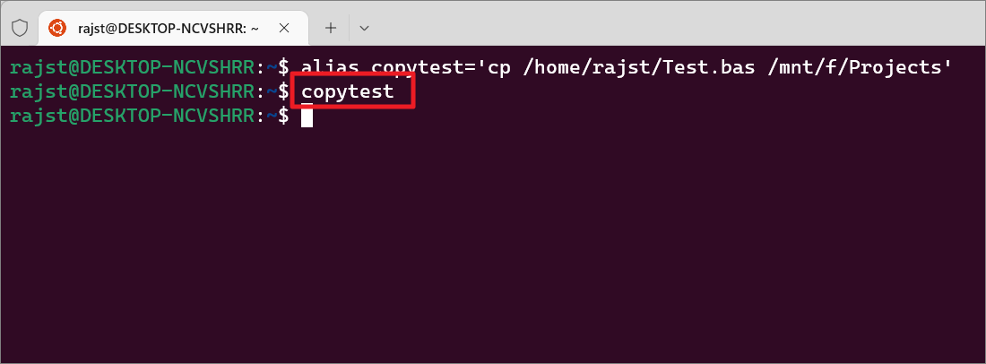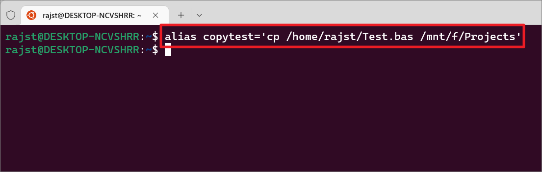 alias copytest='cp /home/rajst/Test.bas /mnt/f/Projects'