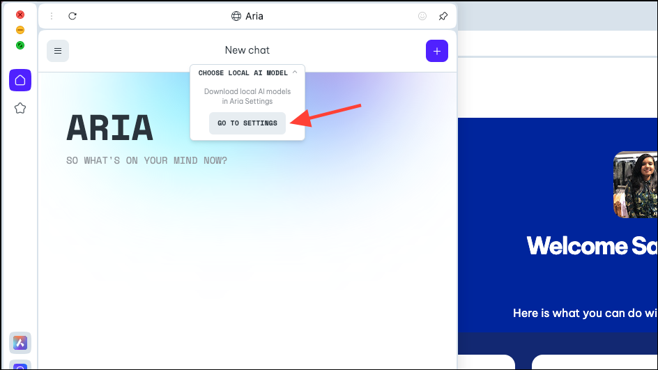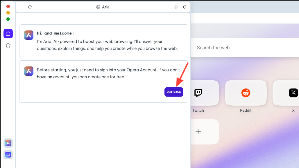 - Once the browser is downloaded, click on the 'Aria AI' icon from the left sidebar.