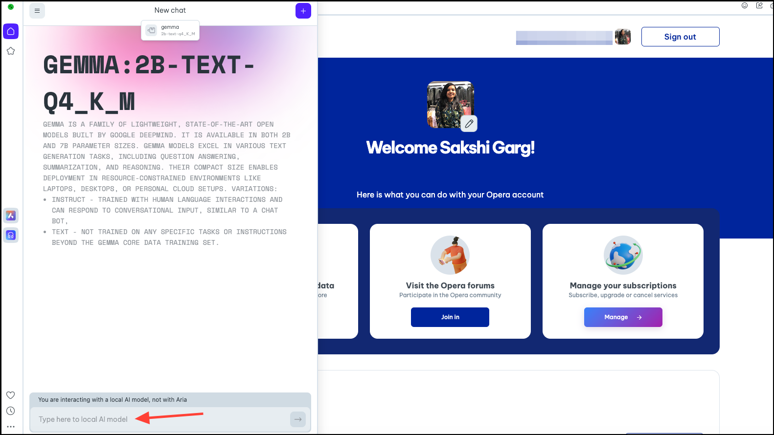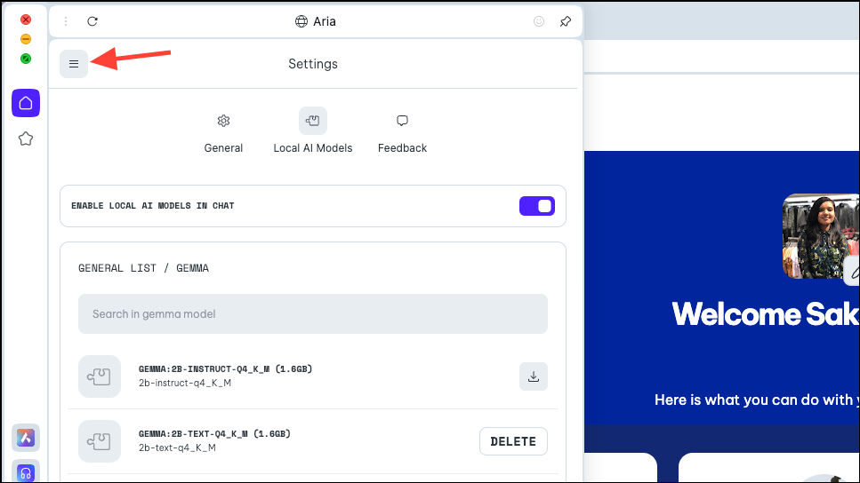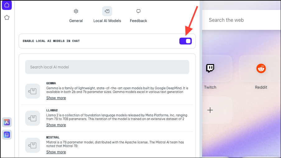 To use the local LLM models, you'll need 2-10 GB of space on your computer, depending on the variant you'll be using. Some of the supported LLMs include Llama from Meta, Phi-2 from Microsoft, Gemma from Google, Vicuna, Mixtral from Mistral AI, etc. You can use these language models instead of the Aria AI from Opera and switch back to Aria AI whenever you want.