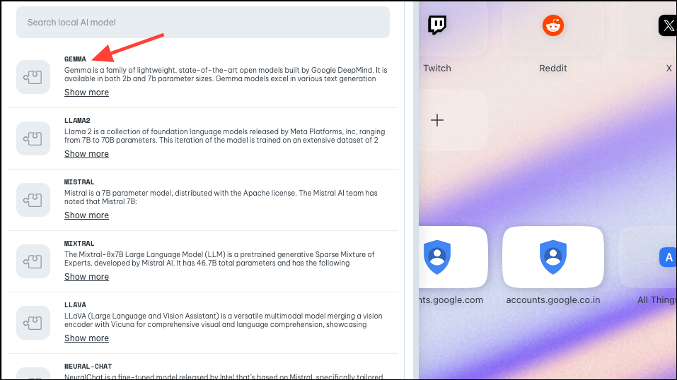 - So, for some models, when you click some of the models, like Google's Gemma, you'll get 4 different variants. Download the model you want to use.