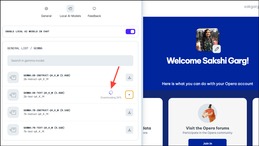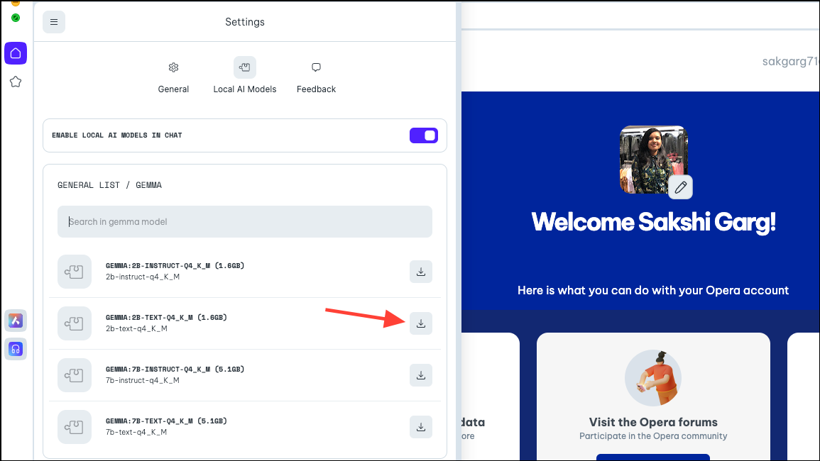 - Next, choose the model you want to download for local use, by either clicking or searching for it. As mentioned above, Opera has implemented support for approximately 50 model families with different variants, bringing the total to 150.