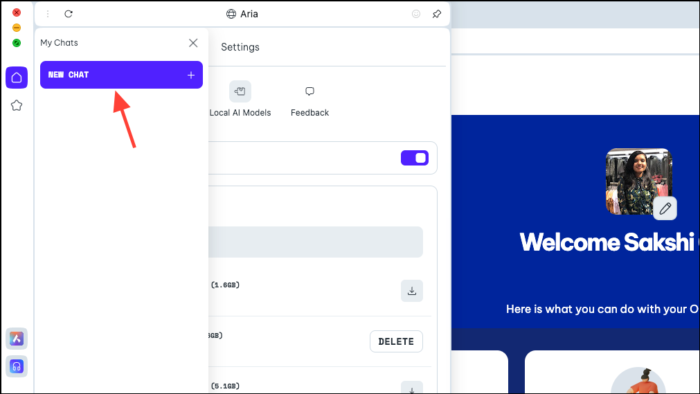 - Your chats with the Local AI model will be available in the chat history, just like your chats with Aria are. You can also rename the chats for better organization.