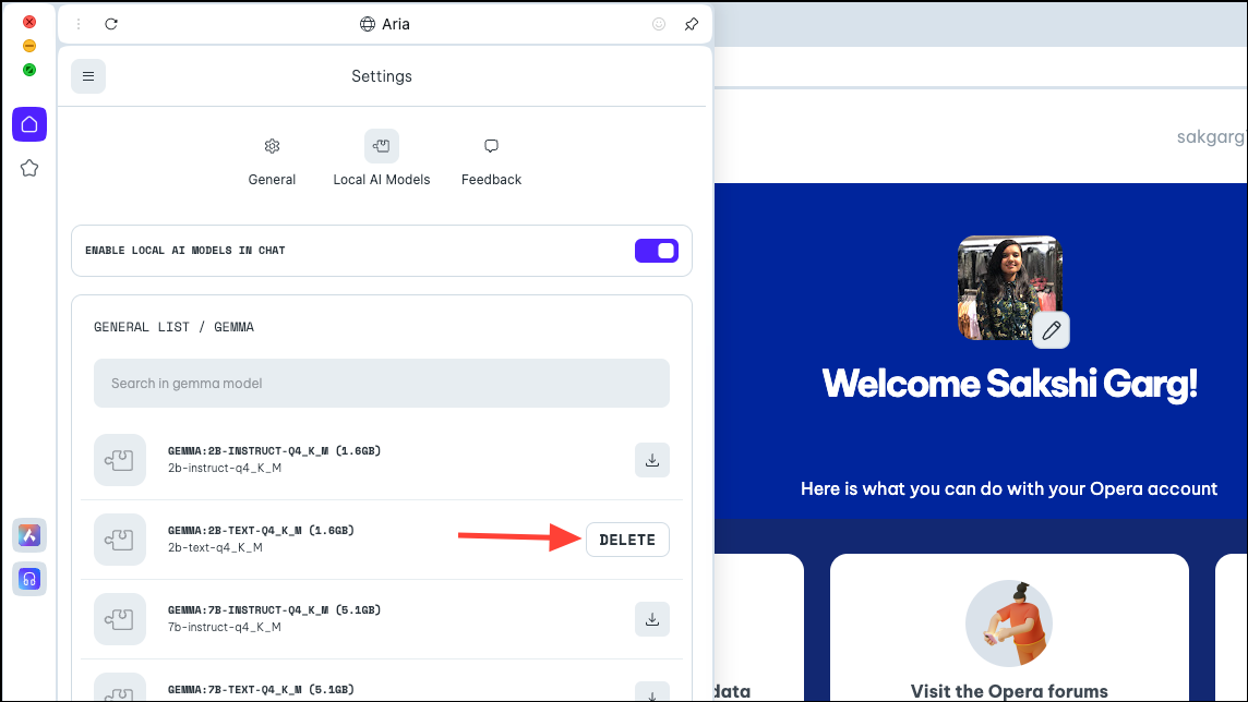 Aria>Settings>Local AI Models>[Downloaded Model]. Then, click the 'Delete' button.