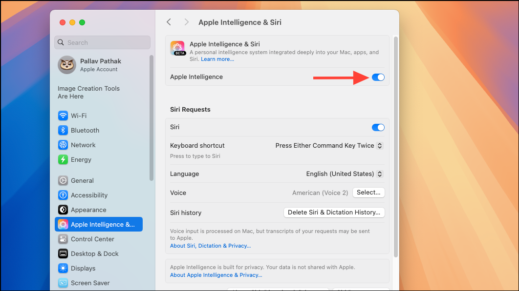 Step 3: Once your Mac is updated, open System Settings and select Apple Intelligence & Siri from the sidebar. Click the Turn on Apple Intelligence button and follow the on-screen prompts to activate the feature.