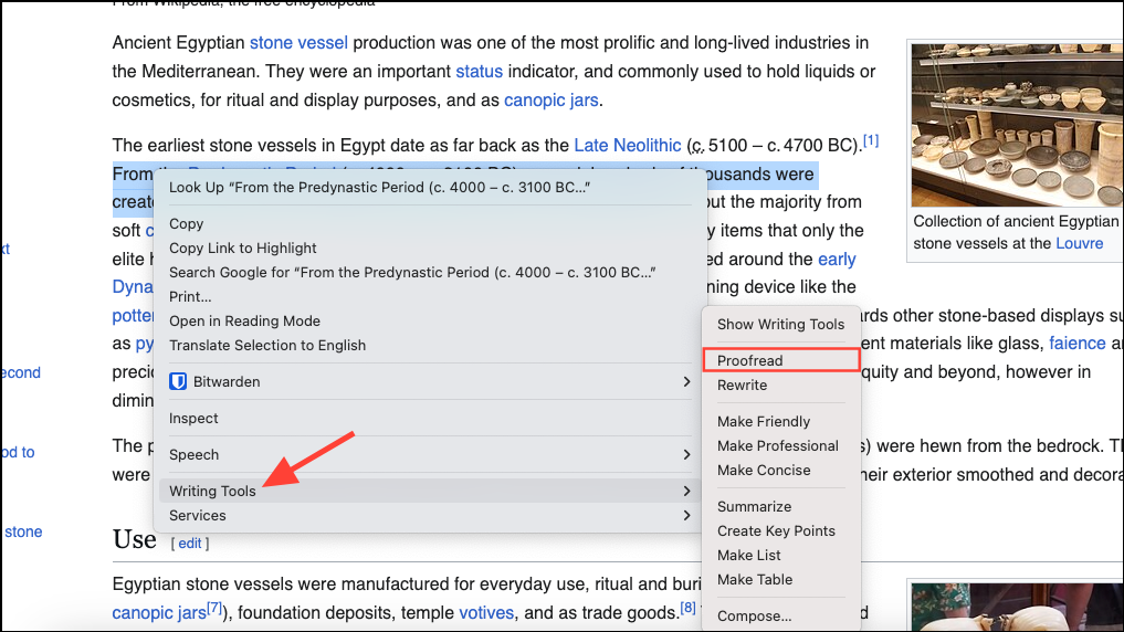 Step 1: To proofread your text, highlight the text you wish to check within any app, such as Notes, Pages, Mail, or even third-party apps like Chrome or Slack. Right-click (or Control-click) the selected text and choose Writing Tools > Proofread.