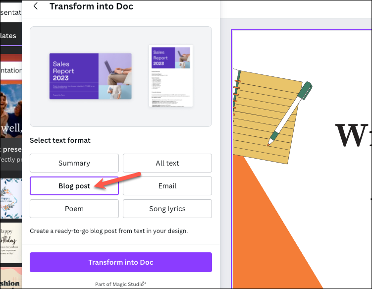 - If you chose Transform into Doc, select the format you want to transform it into. You have six options to choose from at the moment: 'Summary', 'All text', 'Blog post', 'Email', Poem', and 'Song Lyrics'. For this guide, let's try out 'Blog Post'.