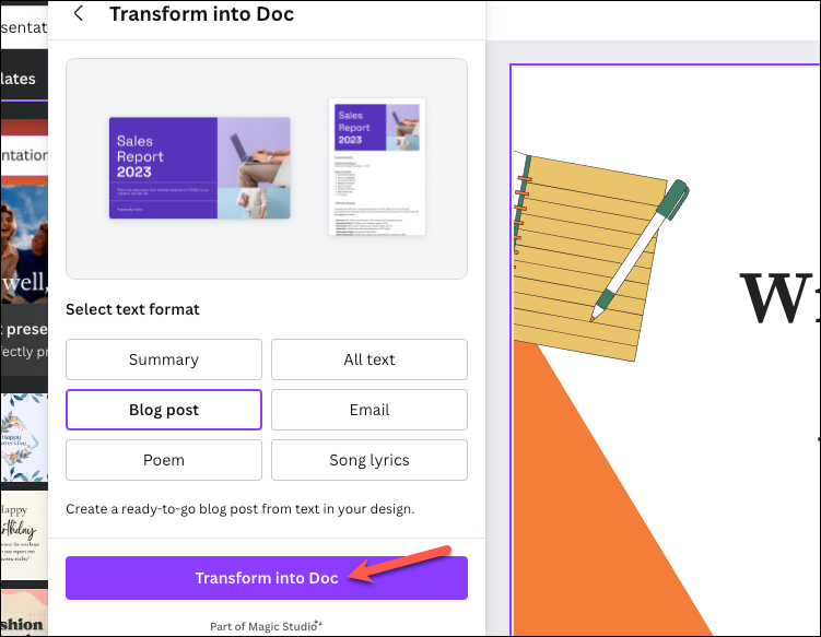 Magic Switch is available for Canva Pro, Canva for Teams, Canva for Education, and Canva for Nonprofit users. You can transform your social media posts, presentations, etc., to Canva Docs with Magic Switch; it is not available for Docs though. To transform your design using Magic Switch, follow these steps: