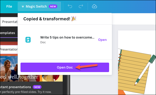 - It'll take a few seconds for Magic Switch to work its magic. When the transformation is complete, you'll see 'Copied & transformed' on your screen. Click the 'Open Doc' button to view the doc.