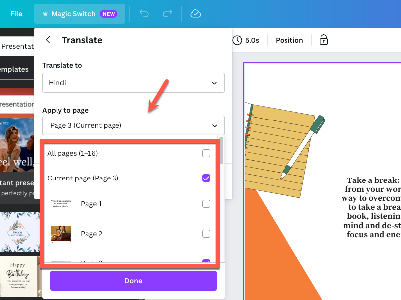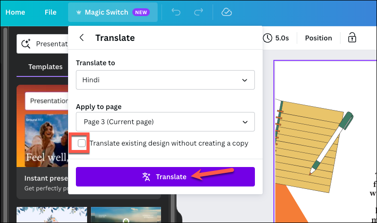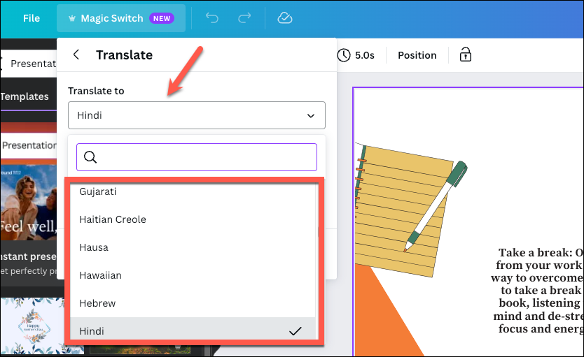 - If you chose 'Translate' from the Magic Switch menu, first, select the language you'd like to translate into from the 'Translate to' drop-down menu. Canva offers a great range of languages that you can translate into.