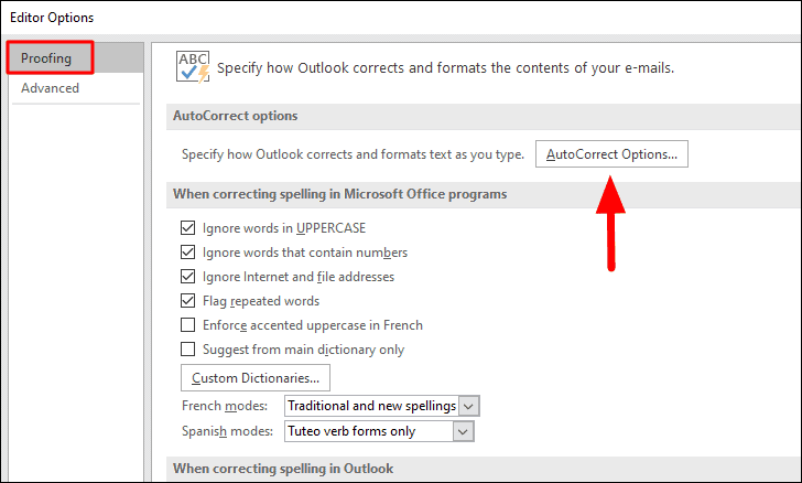 The ‘Editor Options’ window will launch with the ‘Proofing’ tab open by default. On the right, you will find the ‘AutoCorrect Options’ icon, click on it.