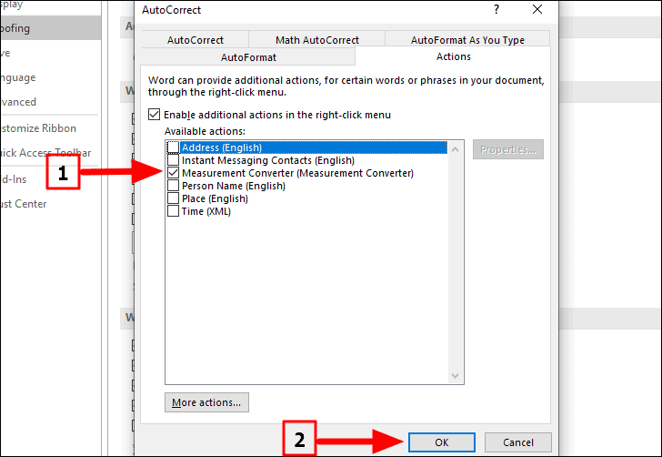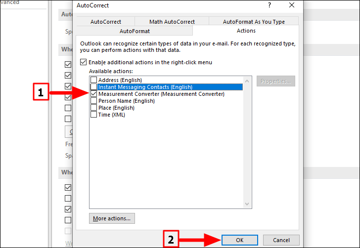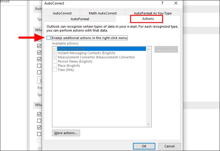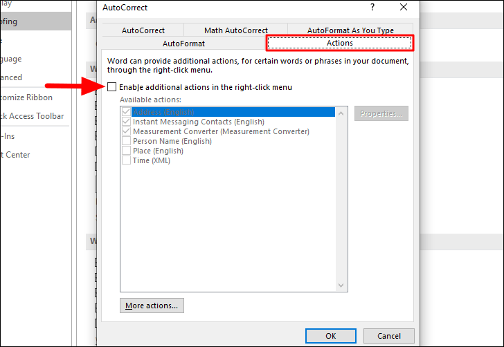 In the ‘AutoCorrect’ window that opens, select the ‘Actions’ tab and then check the box before ‘Enable additional actions in the right-click menu’.