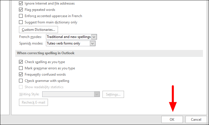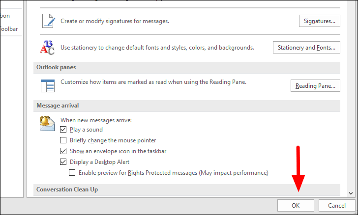 Finally, click on ‘OK’ at the bottom-right corner of the ‘Outlook Options’ to save the changes and close the window.
