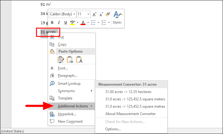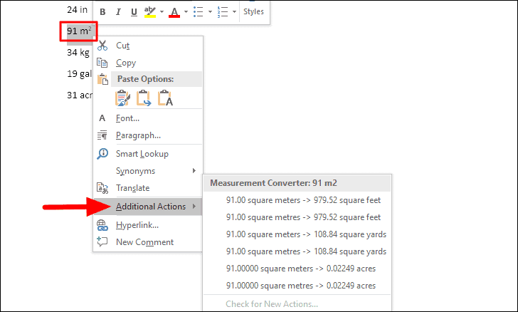 To use the measurement converter, highlight the text with the measurement and then right-click on it. Next, hover the cursor over ‘Additional Actions’ and you will find the measurement converter in the box. We highlighted the unit ‘m2‘ used for measuring area, which was converted to square feet, square yards, and acres.