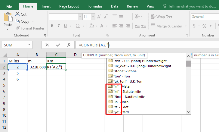 As you enter the formula, Excel will show you multiple suggestions for units that will help with the conversion. These suggestions will help you come with various conversion formulas that you might need while working on Excel.