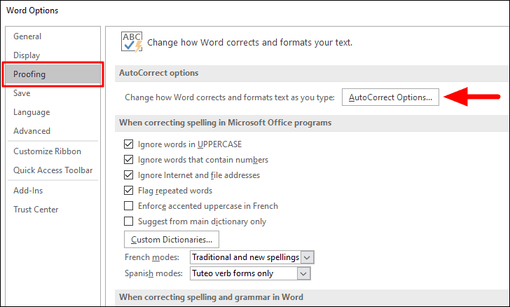 The ‘Word Options’ window will launch with multiple tabs on the left. Select the ‘Proofing’ tab and then click on the ‘AutoCorrect Options’ icon on the right.