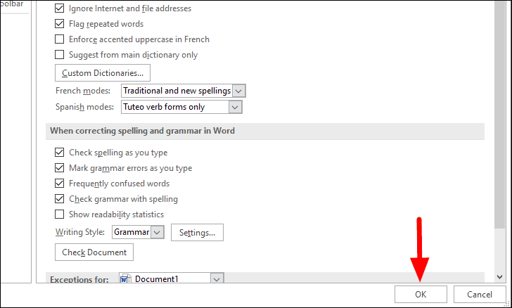 Finally, click on ‘OK’ at the bottom of the ‘Word Options’ to save the changes to Word and close the window.