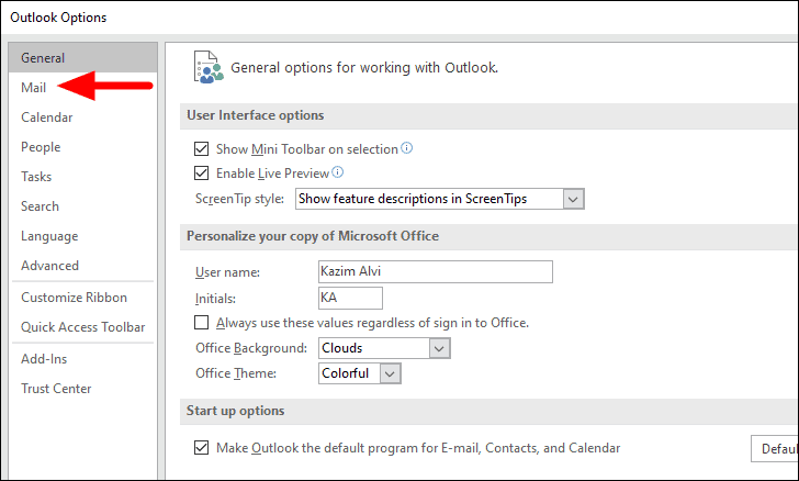 In the ‘Outlook Options’ window, you will find multiple tabs on the left, select ‘Mail’, the second option from the top.