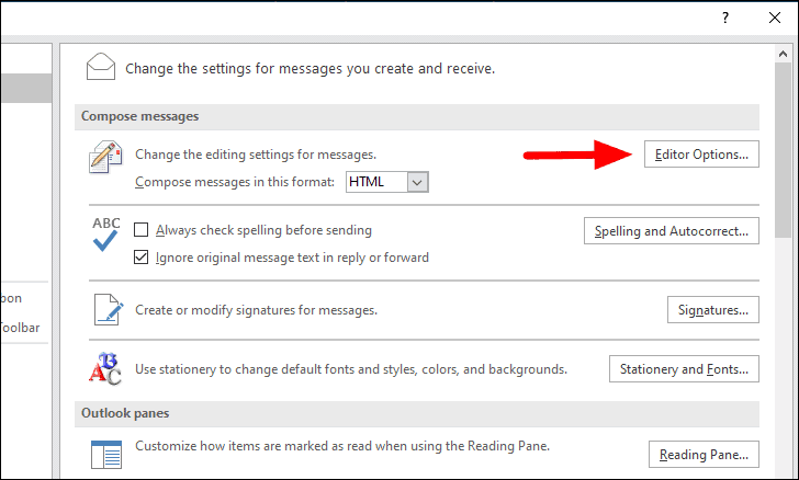 Next, click on ‘Editor Options’ under the ‘Compose messages’ heading.