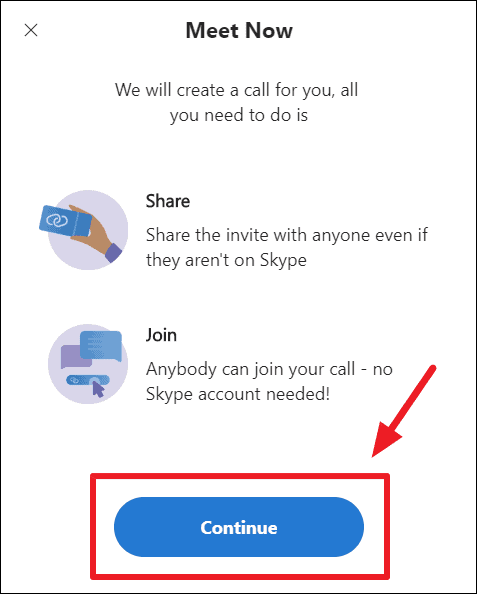 Step 3: If you're using 'Meet Now' for the first time, a pop-up window will appear explaining its features. Click the 'Continue' button to proceed.