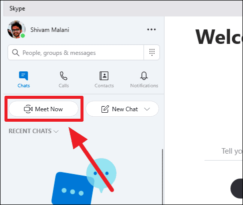 Step 2: In the Skype dashboard, locate and click the 'Meet Now' button on the left-hand panel, just above the 'Recent Chats' list. This will initiate the creation of a new Skype meeting.